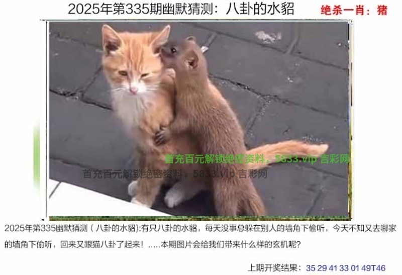 2025年第335期幽默猜测(八卦的水貂):有只八卦的水貂,每天没事总躲在别人的墙角下偷听,今天不知又去哪家的墙角下偷听,回来又跟猫八卦了起来!..本期图片会给我们带来什么样的玄机呢? 综合特肖:兔猴牛狗鸡鼠 幽默猜测综合推荐:绿蓝+大数 |